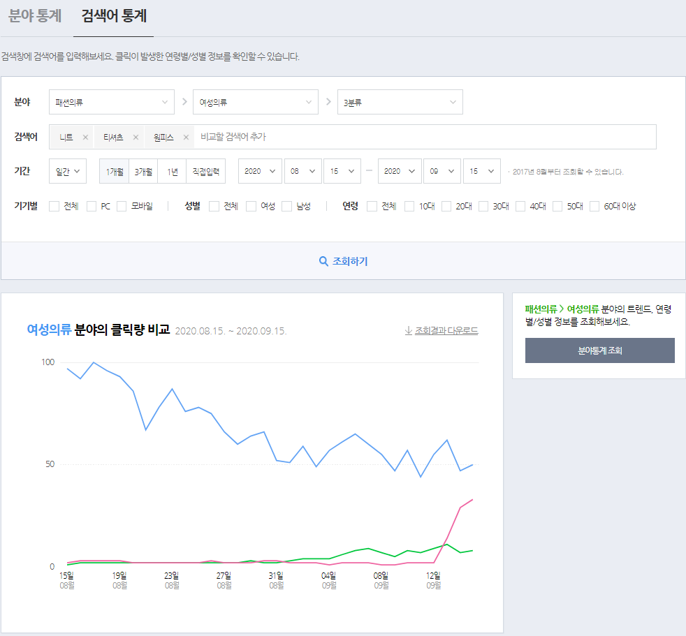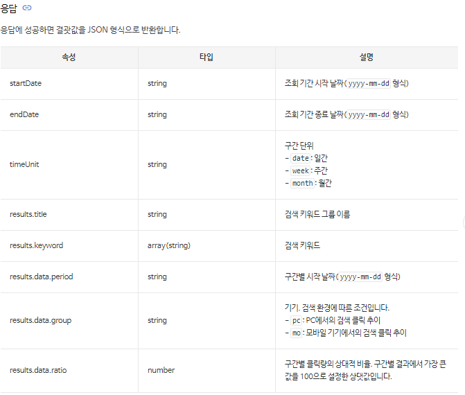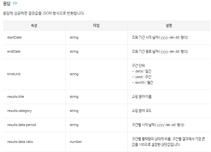 네이버 통합검색의 쇼핑 영역과 네이버쇼핑에서의 검색 클릭 추이 데이터를 JSON 형식으로 반환